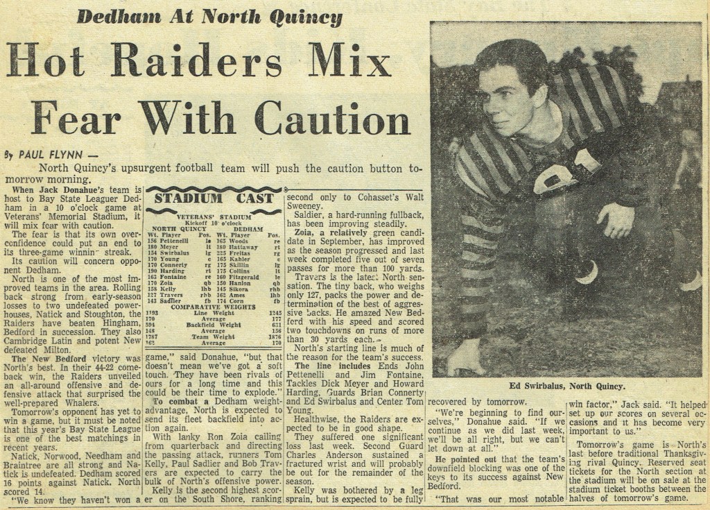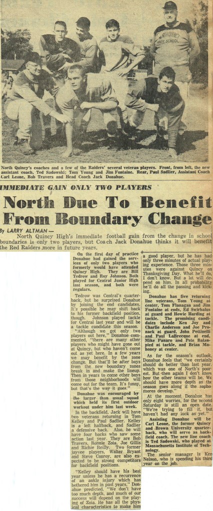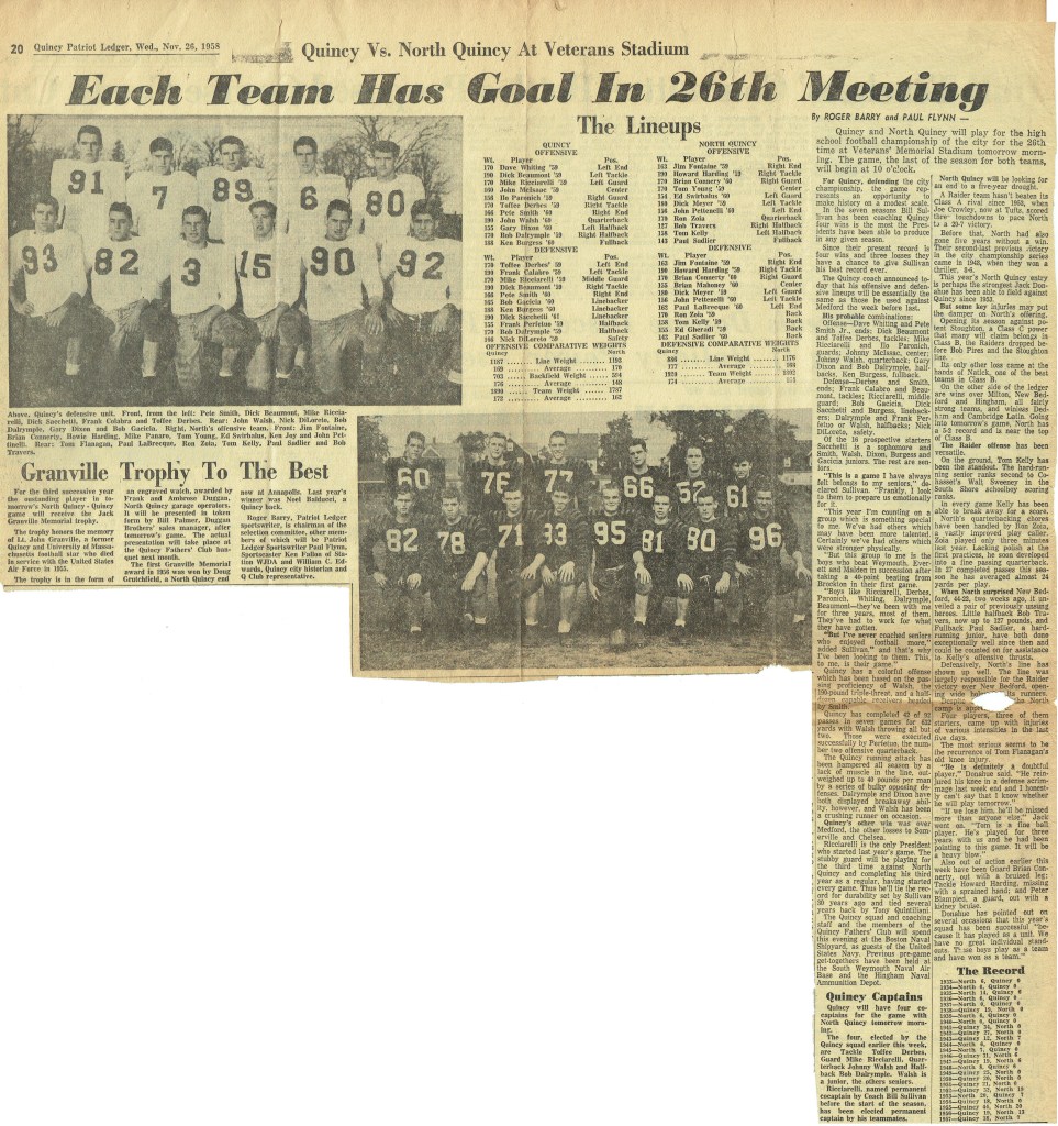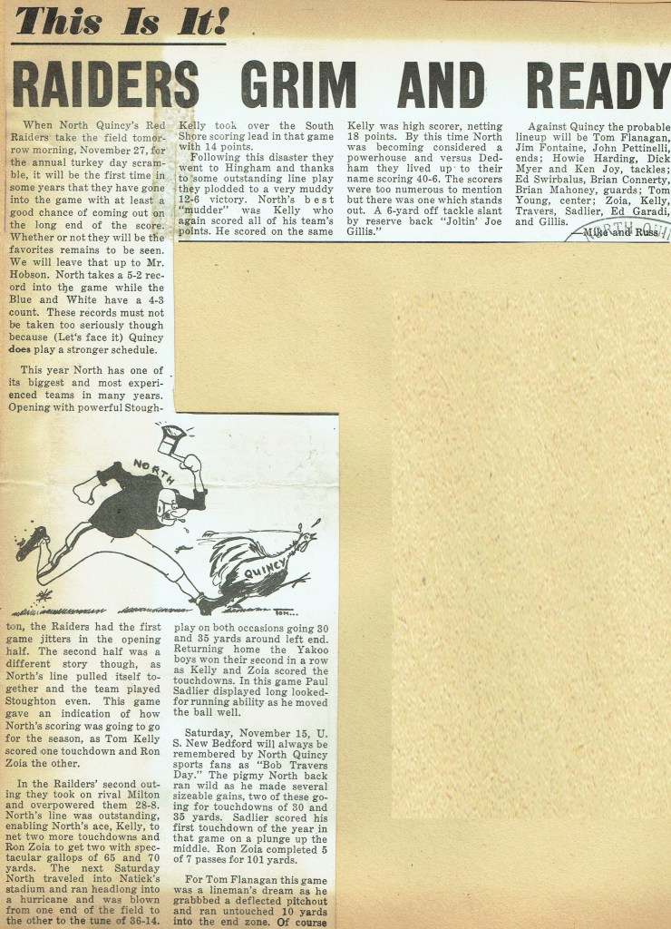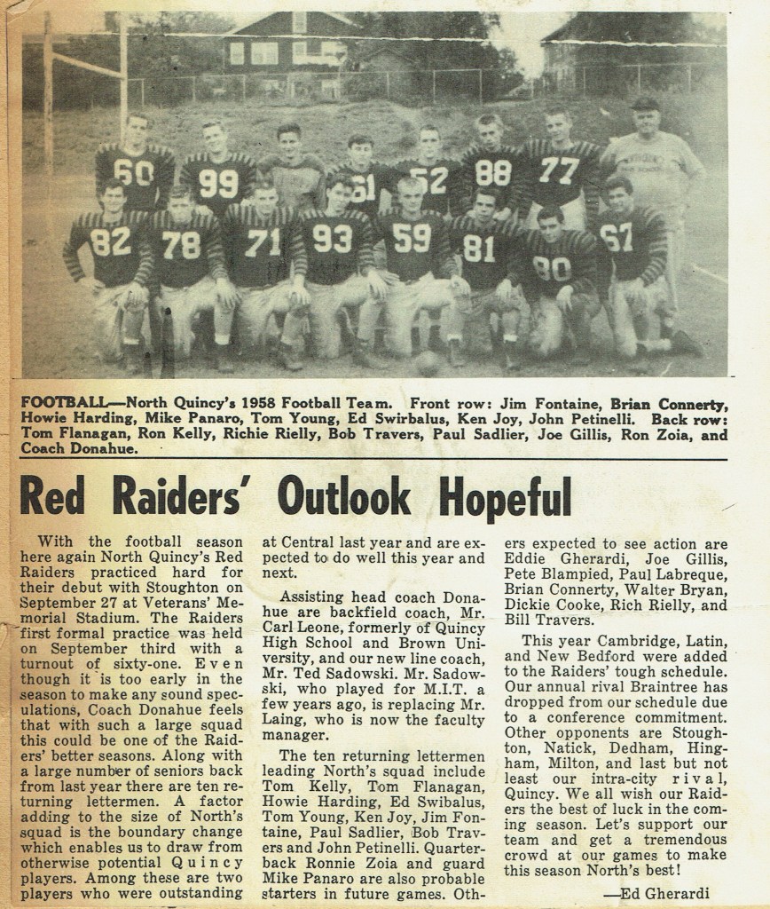 Thanksgiving, so it seems, came too quickly for our team. The Raiders, getting a few bad breaks, went down, defeated but still fighting. The score might have been reversed except for those fumbles. The Sports’ Editorial Staff of the Manet congratulates the football team on their winning season. (Reprinted from North Quincy High School Manet 1959)