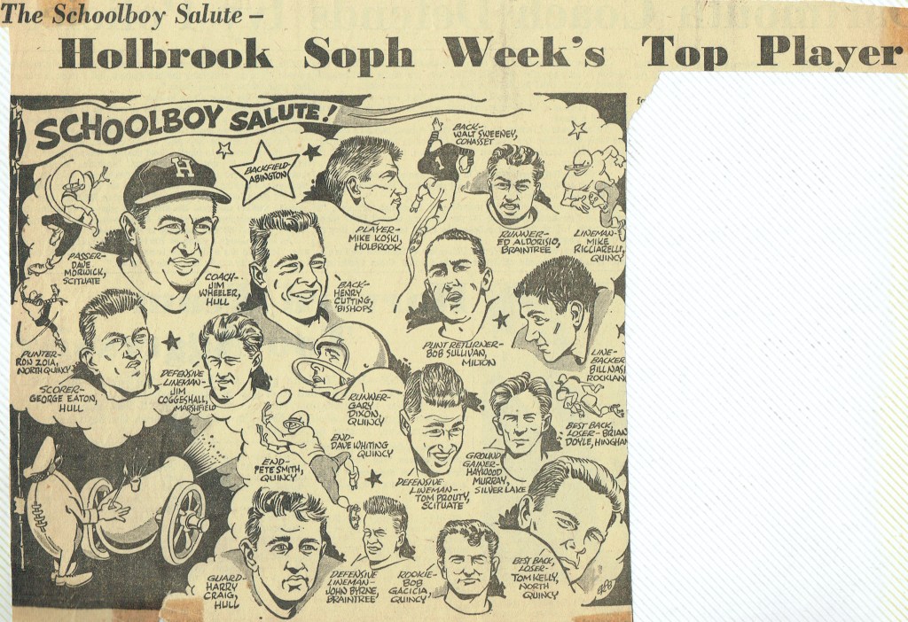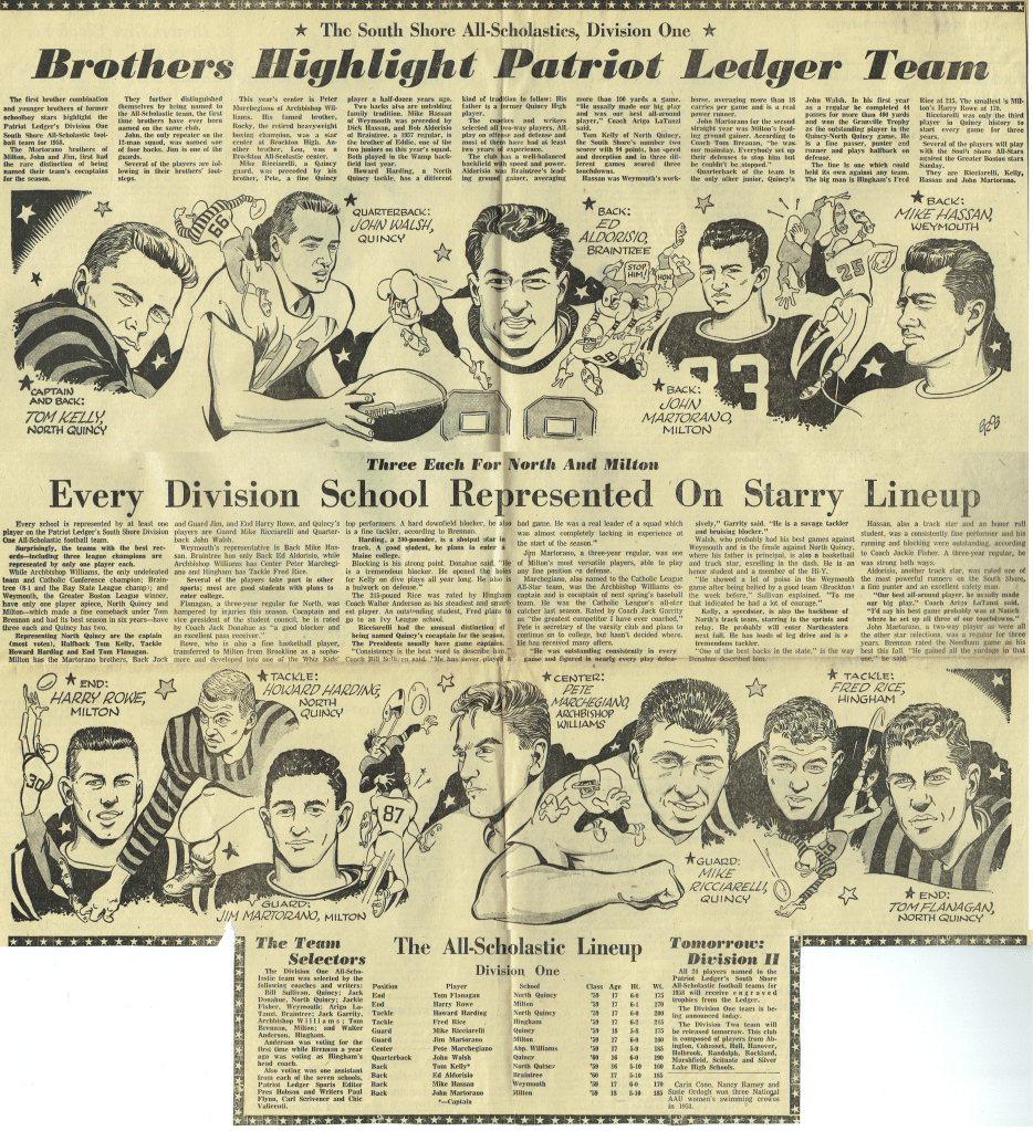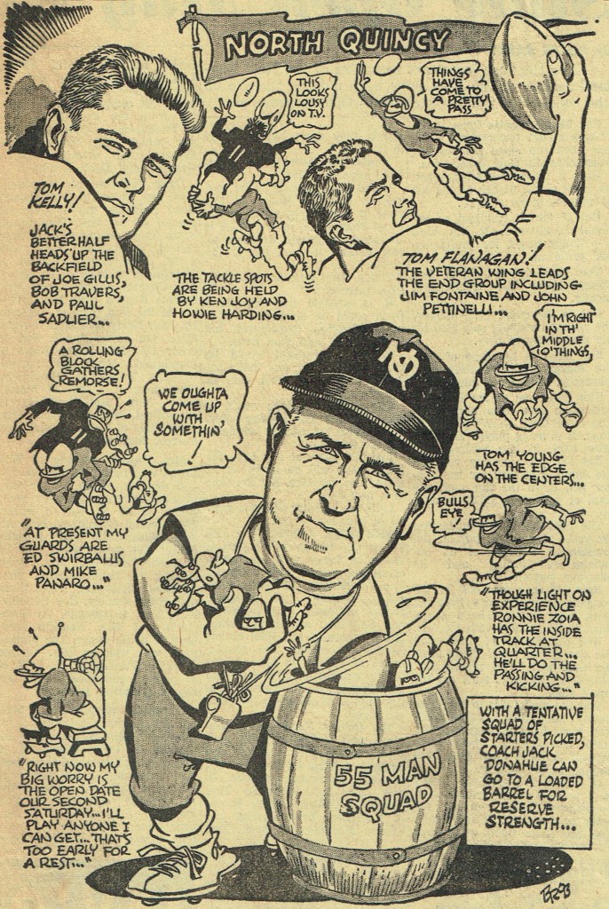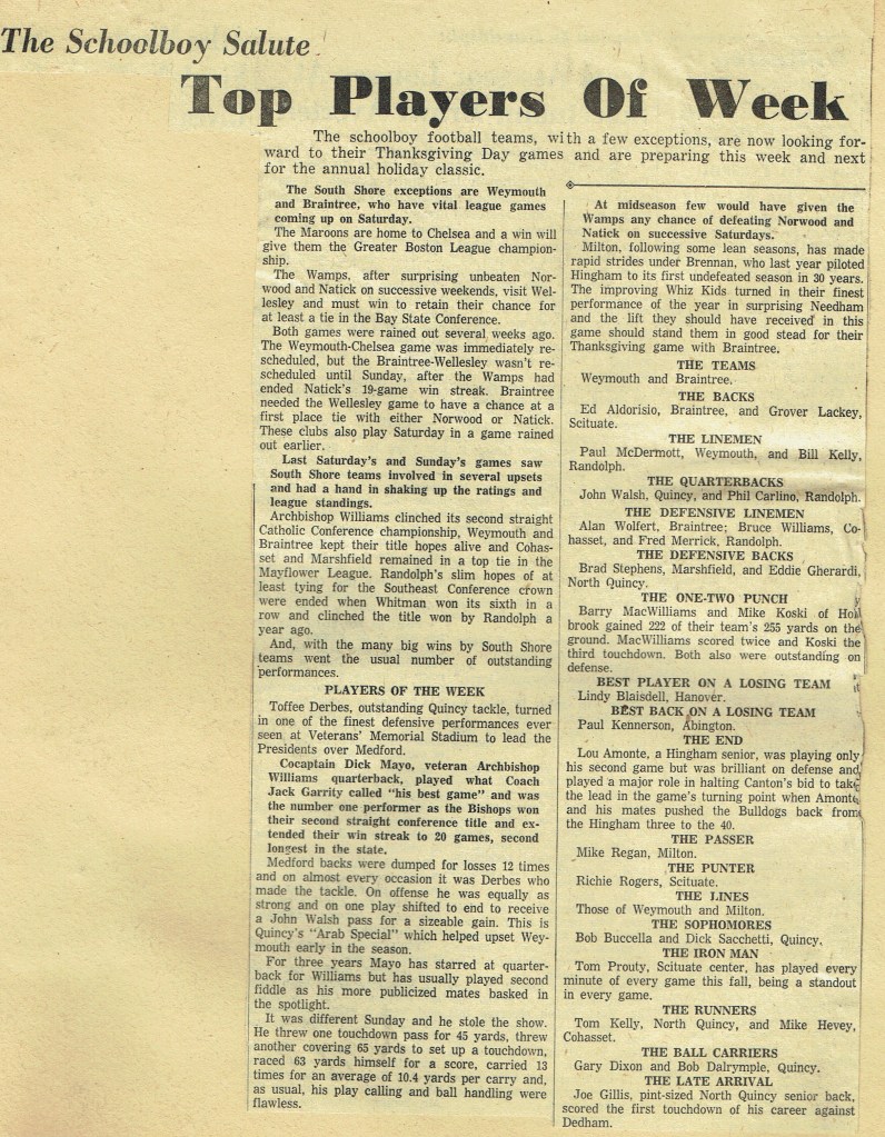 Thanksgiving, so it seems, came too quickly for our team. The Raiders, getting a few bad breaks, went down, defeated but still fighting. The score might have been reversed except for those fumbles. The Sports’ Editorial Staff of the Manet congratulates the football team on their winning season. (Reprinted from North Quincy High School Manet 1959)