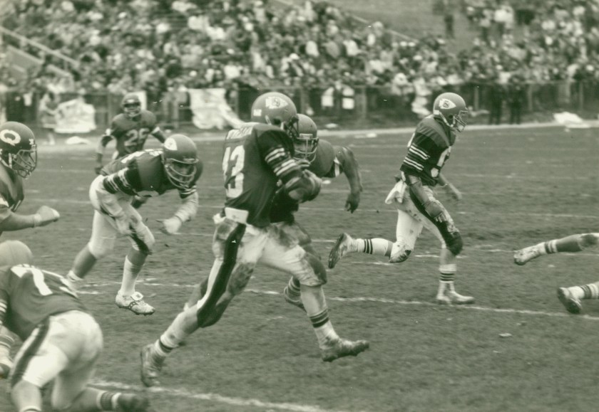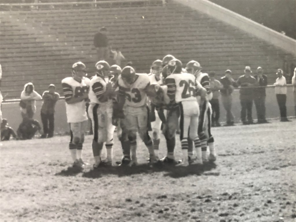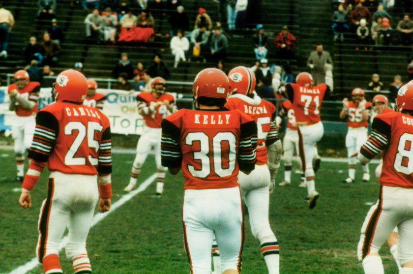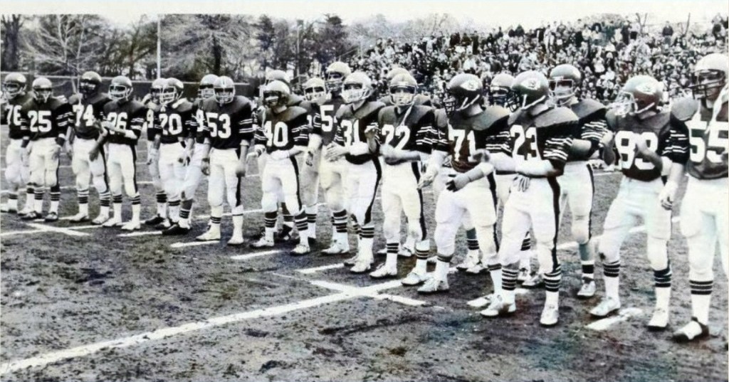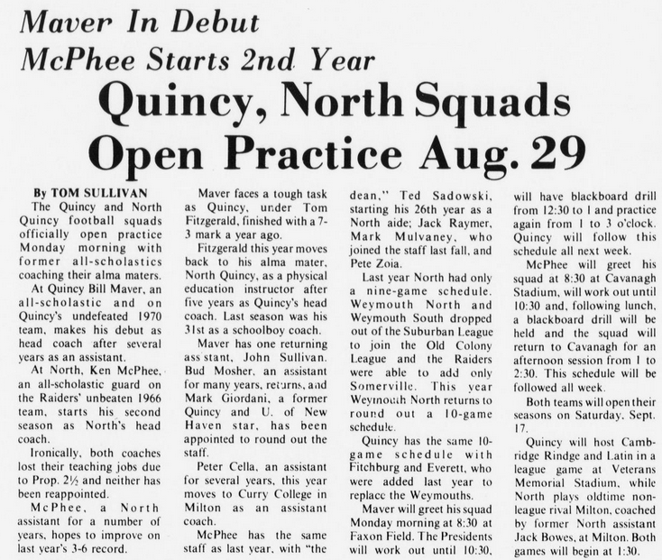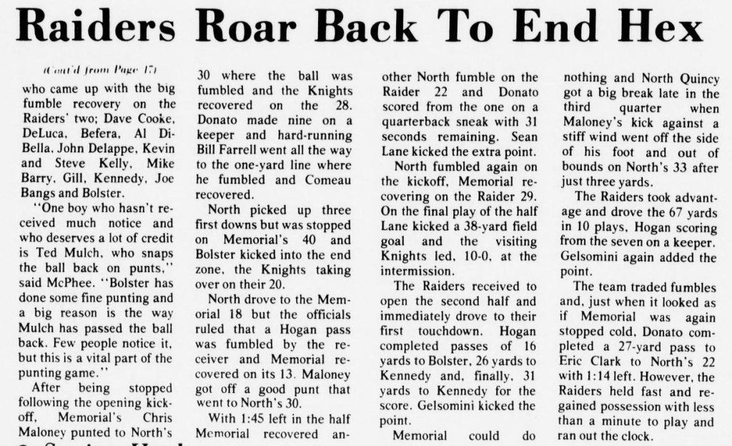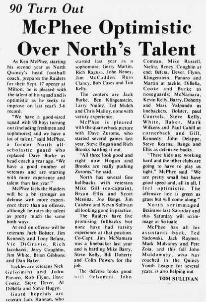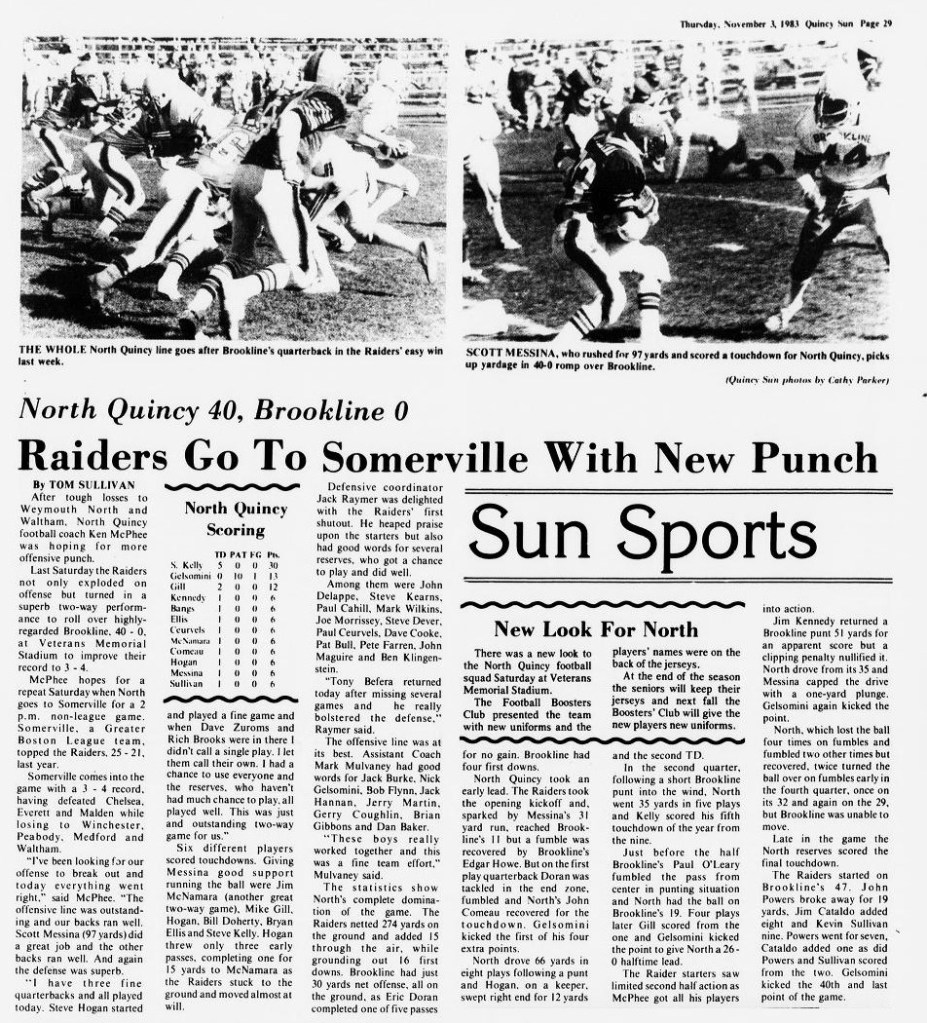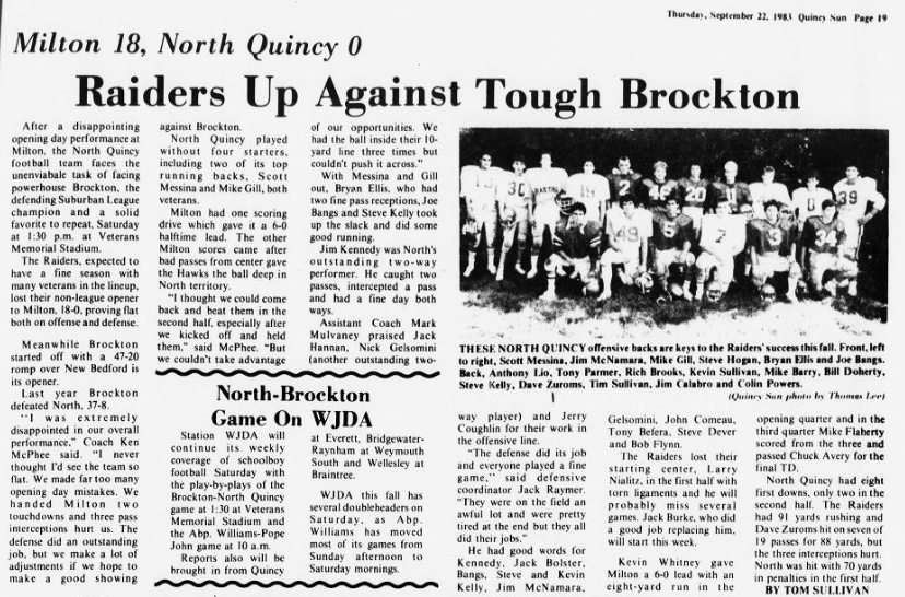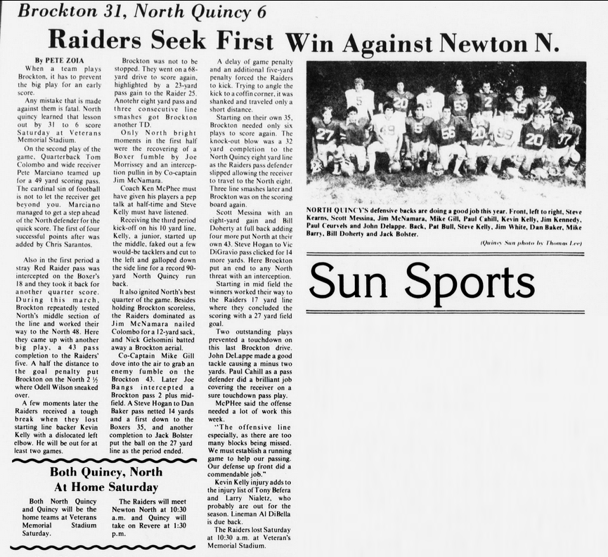 The season opened with two losses for North Quincy. The Raiders were caught off-guard at Milton, and met Brockton the following week. The big play won the game for Brockton, but NQ countered with their own big play, as Steve Kelly ran the opening kickoff of the second half 90 yards for North’s only score in the 31-6 loss.