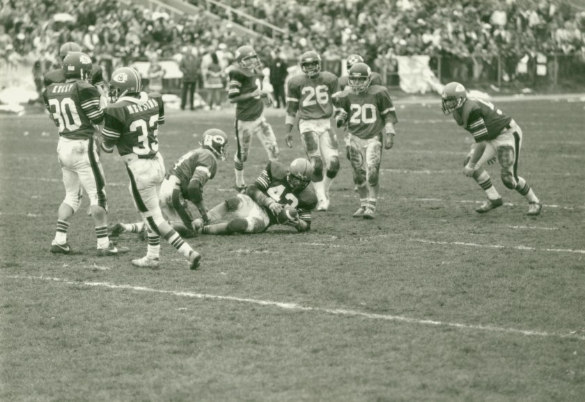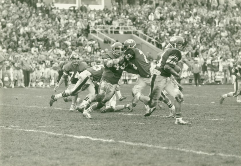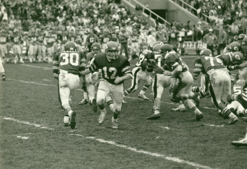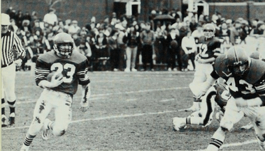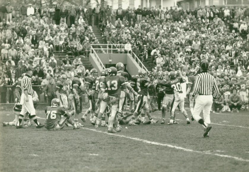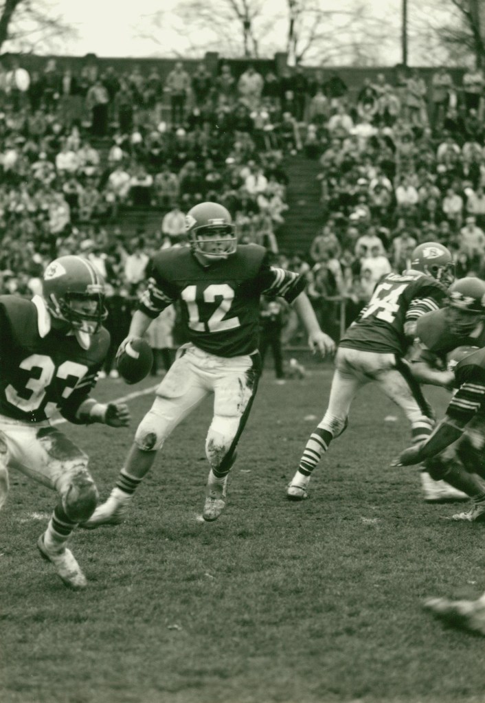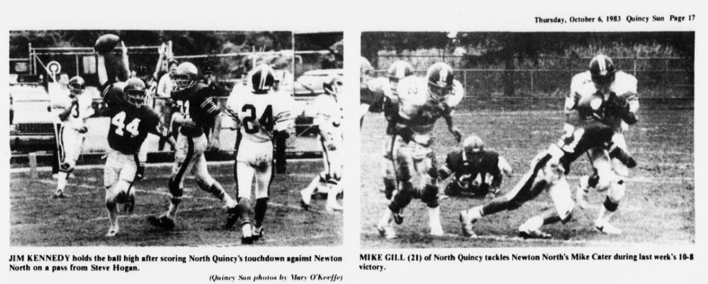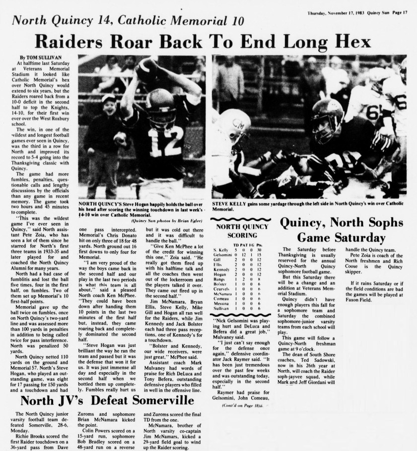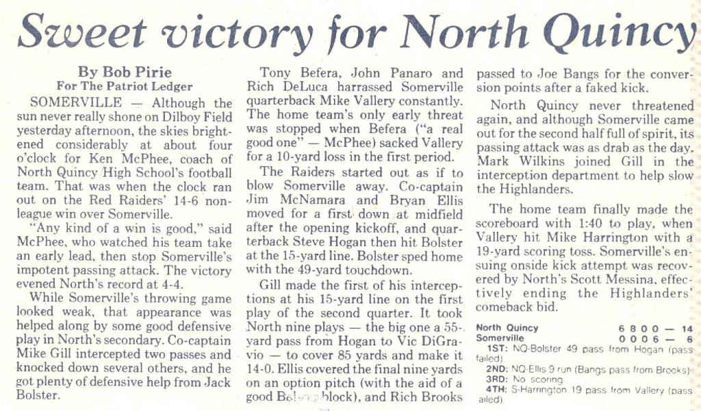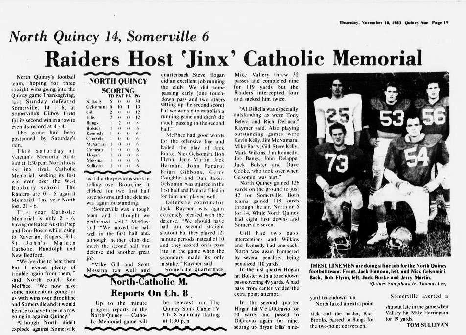 North Quincy won their next two games over tough non-league foes. Somerville was defeated by a 14-6 score as Brian Ellis and Jack Bolster had the scores. The CM jinx was finally broken as North defeated Catholic Memorial 14-10 in a come from behind victory. Jim Kennedy caught a 31 yard TD pass from Steve Hogan, and Hogan rushed 12 yards for the winning score.