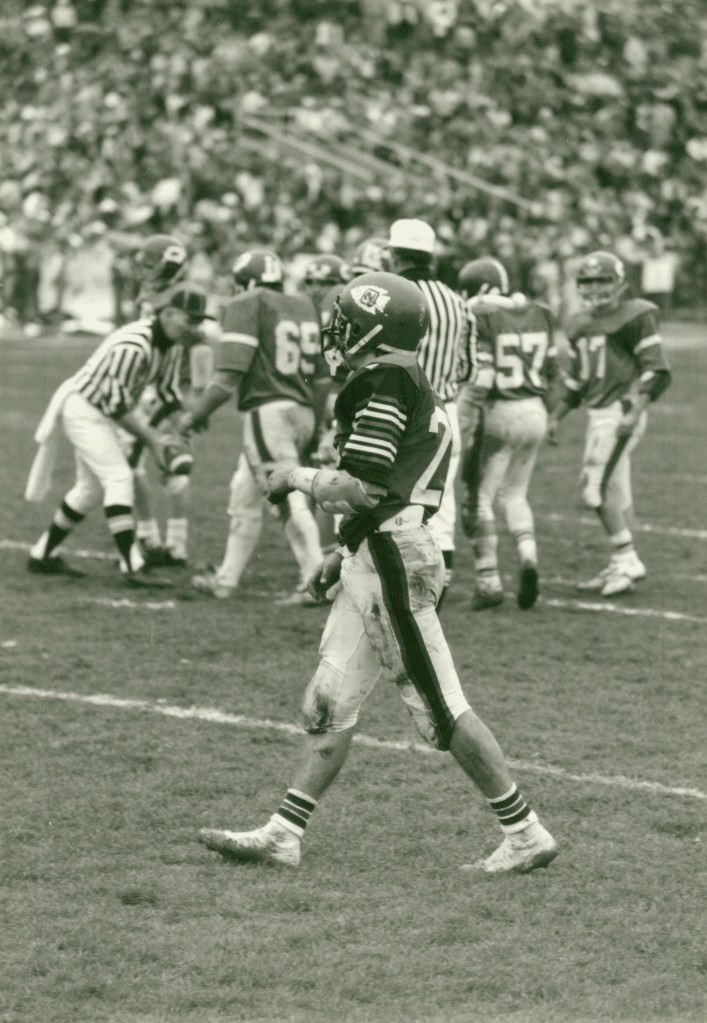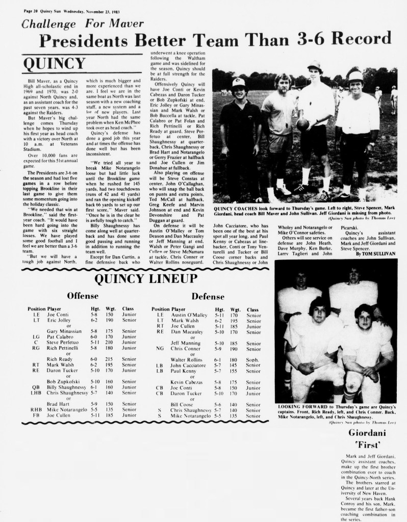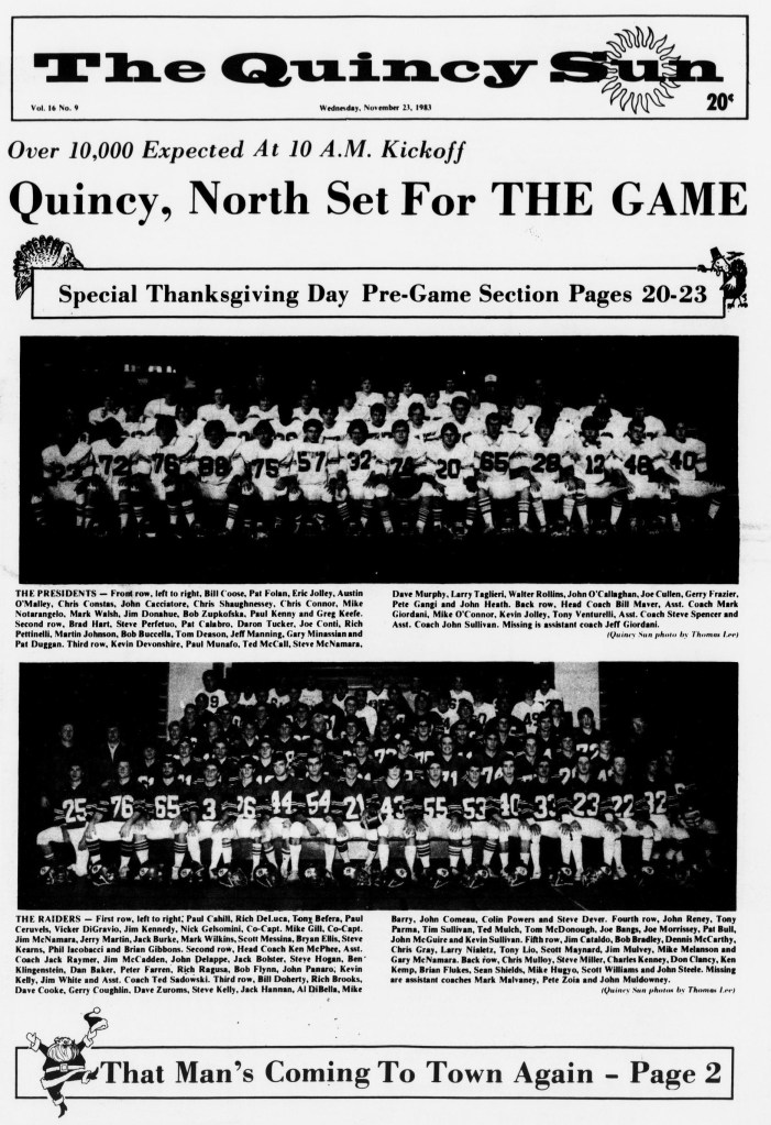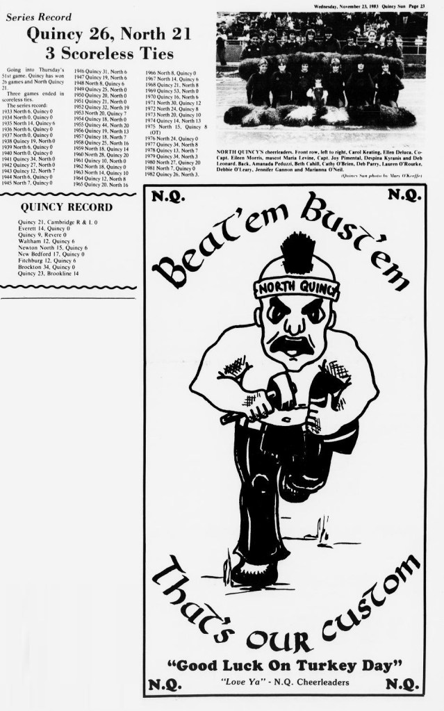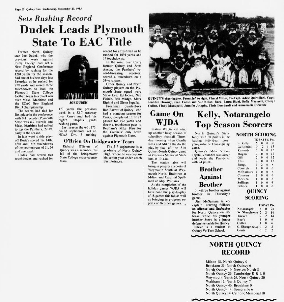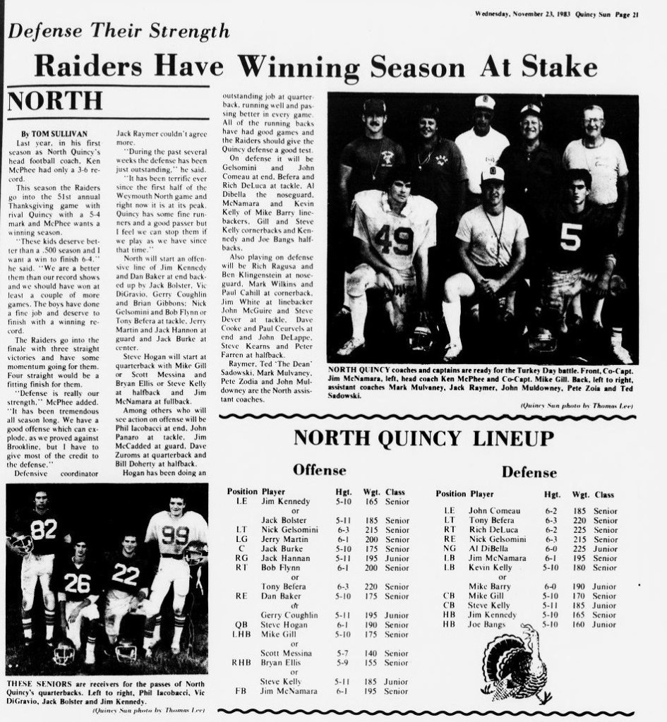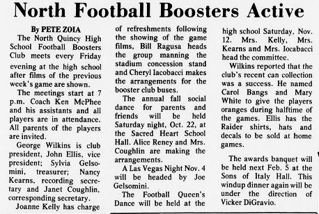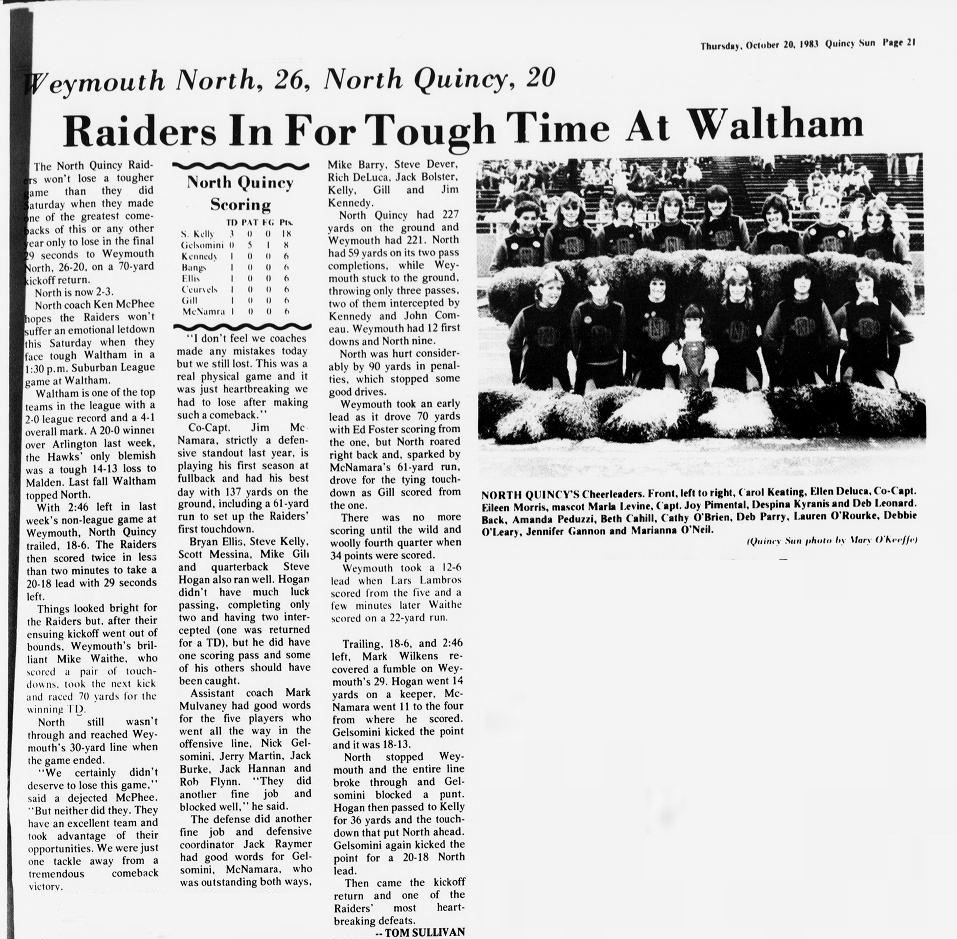 After a 26-0 victory over Cambridge, the toughest loss of the season came at Weymouth North. NQ scored two touchdowns by Jim McNamara and Steve Kelly in the final three minutes to take a 20-18 lead, only to have Weymouth run the ensuing kickoff 70 yards for the winning score in the final 20 seconds.