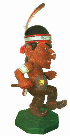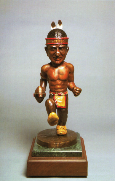 Pete wanted to depict a warrior who reflected working the land and being committed to hard work. To portray this hard work this symbol should have a tool, not a weapon and so he incorporated a stone hammer. Pete never placed a tomahawk or hatchet in “Yakoo’s” hand. In fact he avoided using a bow and arrow, and nowhere do you see a knife, the “Yakoo” overcomes with hard work, not with weapons. General Custer would have liked that. The Red Raider should carry a banner, with school colors, similar to the Marine Gideon to symbolize the representation of small unit pride.