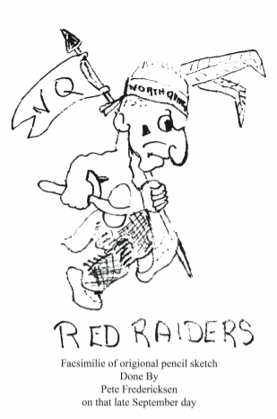 Let’s go back to Miss Agnes Berry’s Family Living and Health Class. The year is 1957 and it is a late September day, with sun shining bright. Principal Mr. James Collins had just retired and Assistant Principal Mr. John Walsh was starting his first year as principal. Student Al Yacubian entered the room and was asked by his classmate Pete Fredericksen to take his glasses off. Pete had an idea. The student council under the direction of Advisor Mr. Murray Roberts, President Gene Schumaker, (Class of 1958) and Treasurer Jim Greene, (Class of 1958) were in search of a symbol for their high school. Students from North Quincy High School were initially known as “The Reds” and then later referred to as “The Red Raiders”. As many other schools (college and high school) were known as Red Raiders the student council wanted a symbol that would be unique to North Quincy High School, separating the North Quincy “Red Raider” from all the others, with a personality all his own. Al Yacubian’s presence put Peter’s pencil in motion.